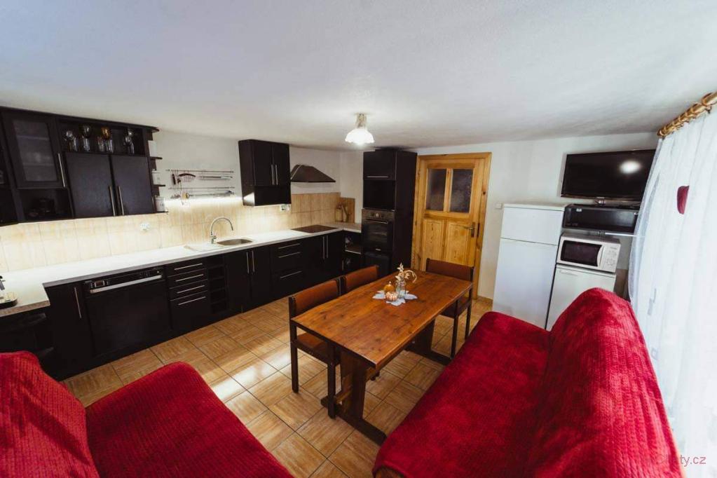 • Ubytování je zde ve 4 pokojích a najdete zde 3 samostatné koupelny, plně vybavenou kuchyň, pergolu s posezením, grilovacím vybavením i otevřeným ohništěm, k dispozici je i vířivka, parkování až pro 5 aut a lyžárnu.