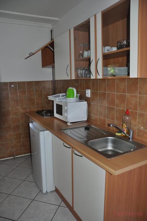 plynový sporák, 2 plotýnky, lednice s mrazákem, kávovar, kuchyňské nádobí
