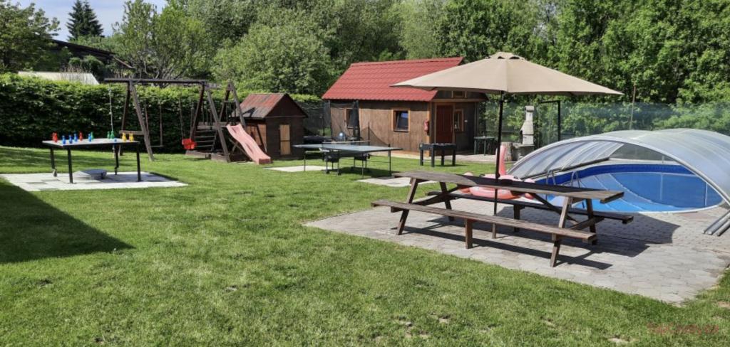 Další: bazén, gril, dětské hřiště, stolní tenis, stolní fotbal, ruské kuželky, badminton, zahradní chata s posezením, pračka