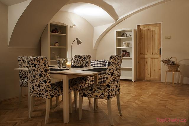 Z obytné místnosti je vstup na chodbu, ze které je přístup do prostorné koupelny s klenbami, s vanou, dále na samostatné WC s malou umývárnou.