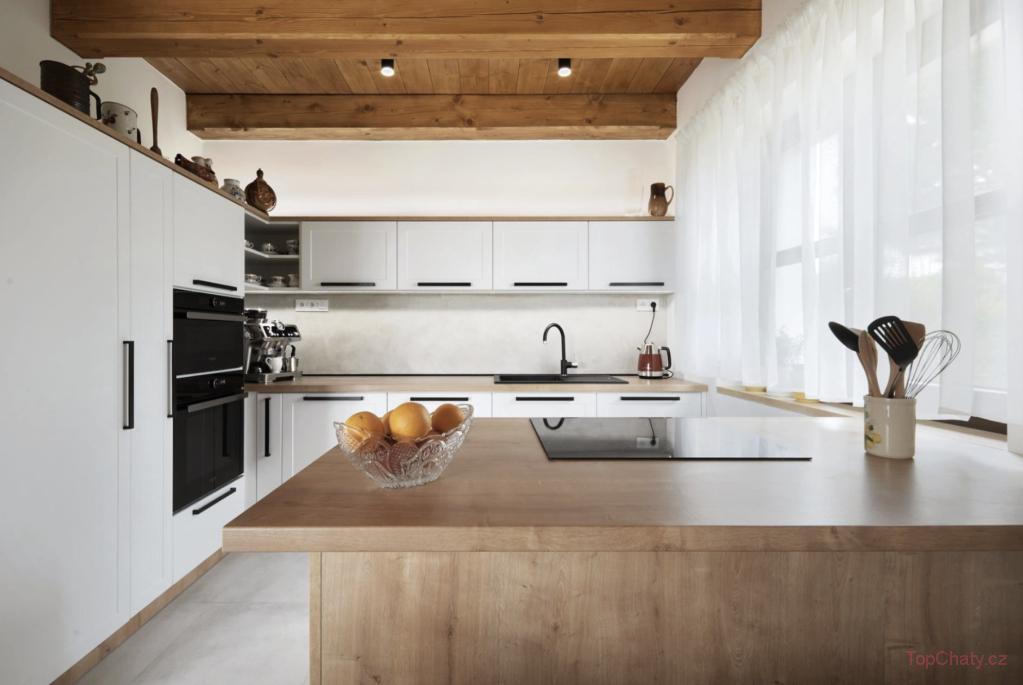 Lednice, vestavěná mikrovlnná trouba, horkovzdušná trouba, varná deska, profesionální kávovar, varná konvice, tyčový mixér, nádobí a kuchařské náčiní a multifunkční hrnec.