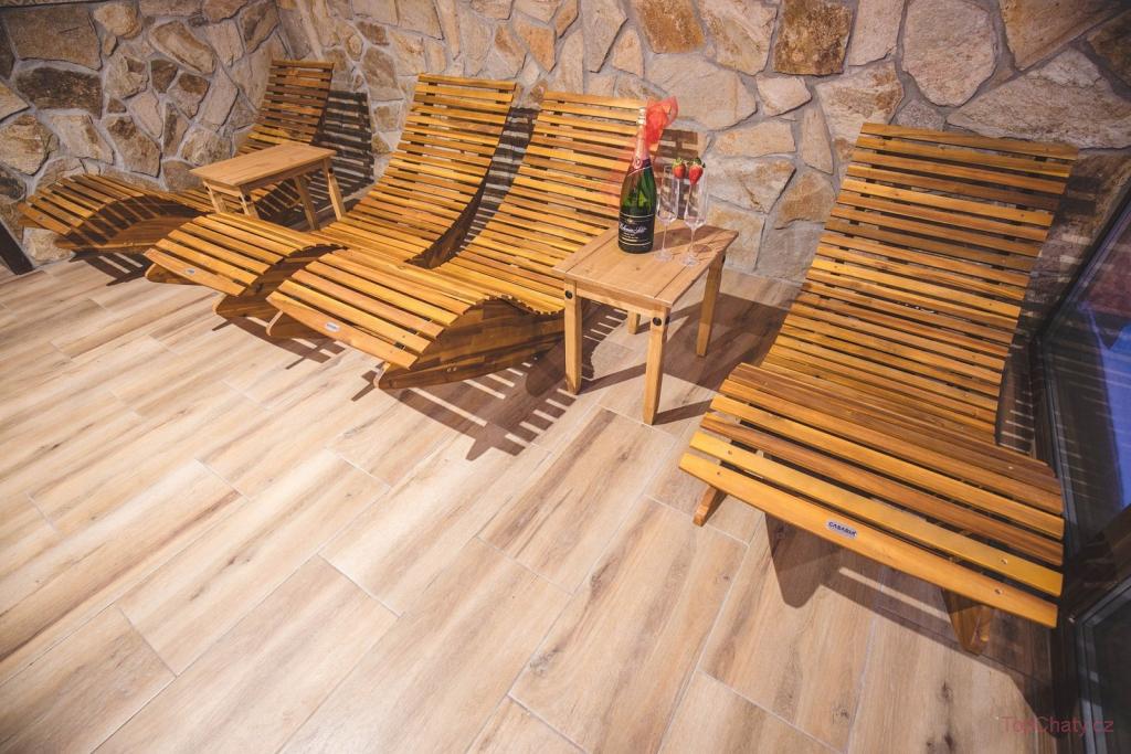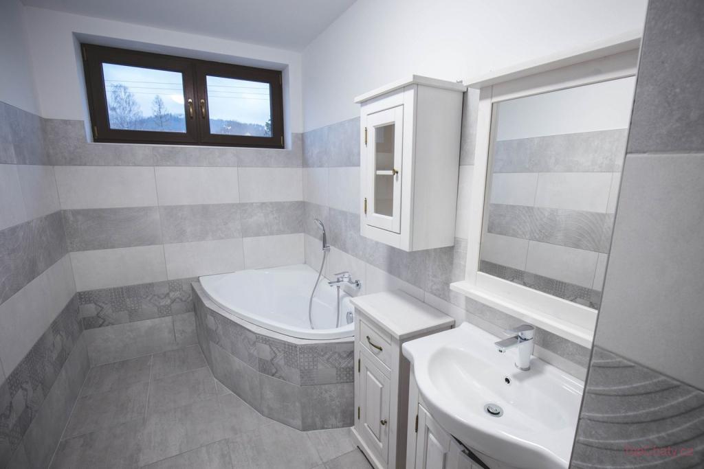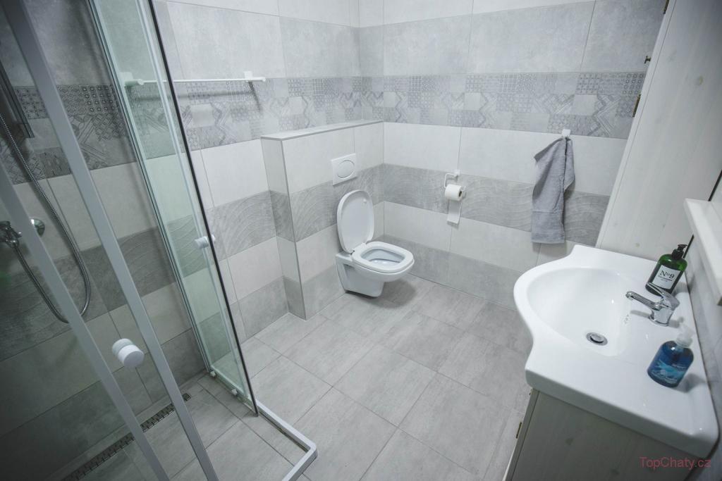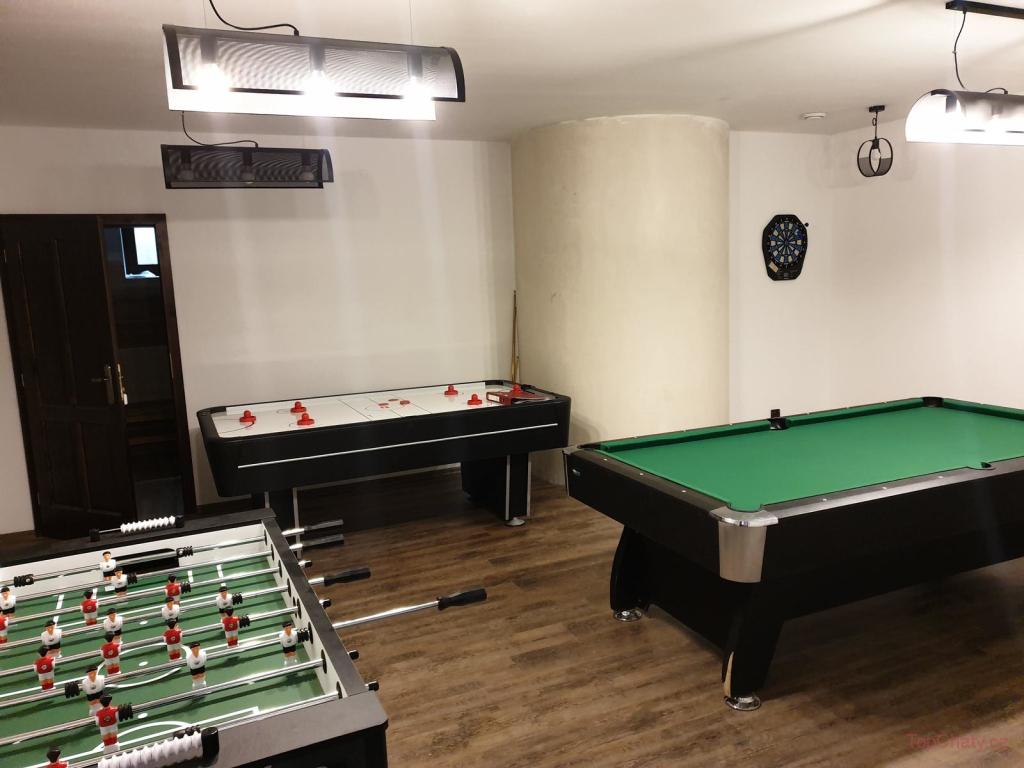 Soc. zařízení V každém poschodí 2x koupelna (sprchový kout) a 2x WC. V apartmánech WC + koupelny s vanou. V suterénu WC pro pivnici a hernu. Wellness má koupelnu a WC.