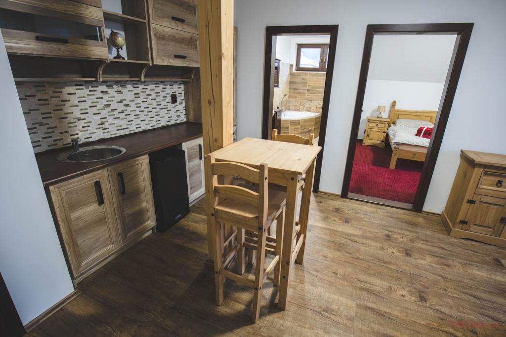 Kuchyň plně vybavená kuchyň v suterénu - profi sporák, mrazák, prosklená chladicí vitrína, myčka a plně vybavená kuchyň v přízemí - indukční deska, lednice, mrazák, varná konvice, mikrovlnná trouba, myčka