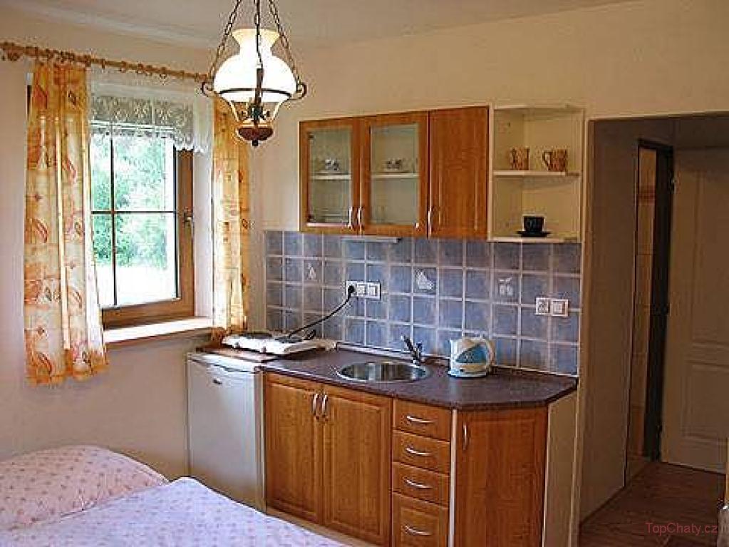 Kuchyň Lednice, varná konvice, dvouplotýnkový vařič, mikrovlnka a základní nádobí.