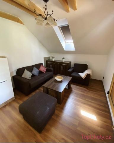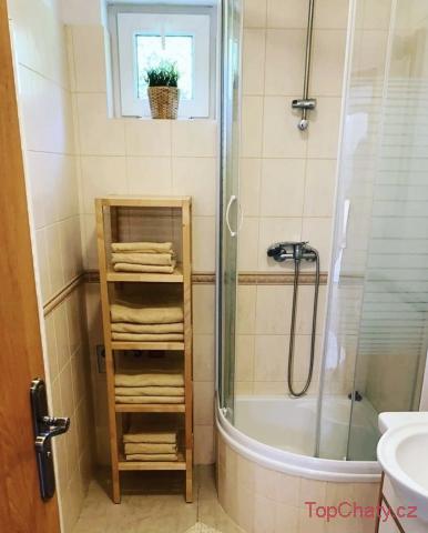 Horní apartmán má 2 ložnice s manželskou postelí, plně vybavená kuchyň s ledničkou, elektrickým sporákem, troubou, veškerým nádobím, koupelna se sprchovacím koutem, zvlášť wc.
