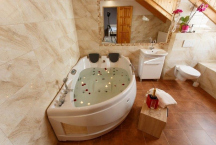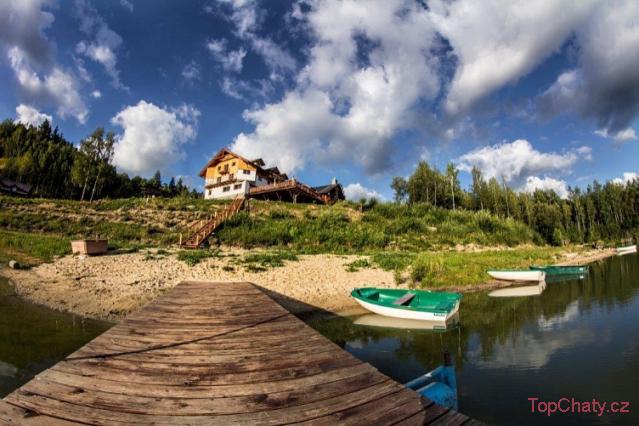 - Chata nad Jezerem k pronájmu poskytuje možnost ubytování pro 10 osob v celkem 4 ložnicích a mezonet s manželskou postelí , dále kuchyně s kachláky a vířivou vanou .
