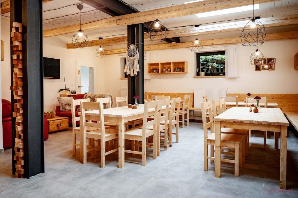 Další: wellness - sauna, koupací jezírko a koupací sud, gril, ohniště, parkoviště, ping-pong, hřiště a dětské hřiště, lyžárna, terasa, společenská místnost, herna