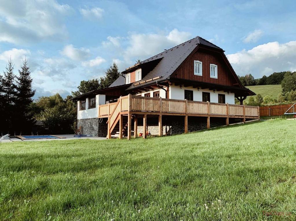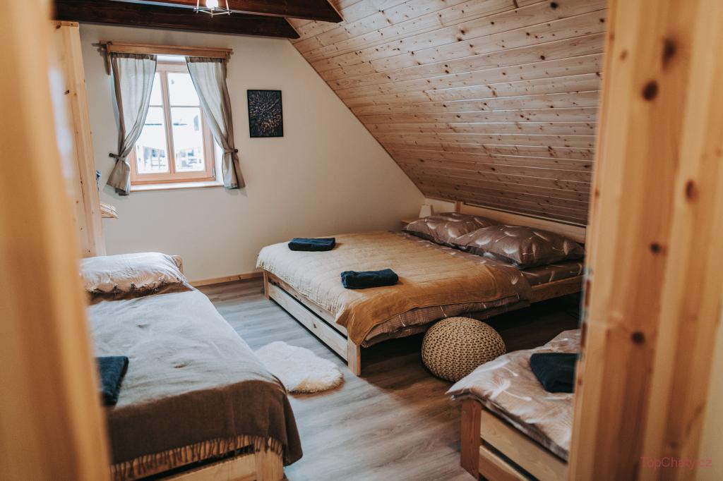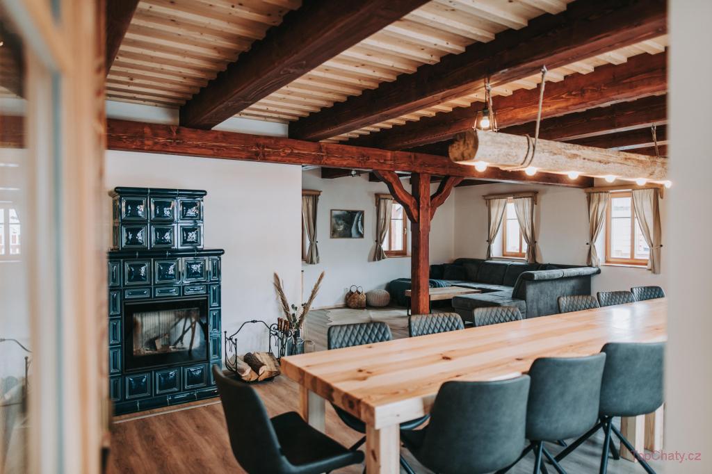 🏡 Chata pod hvězdami se nachází v obci Sobotín nedaleko Velkých Losin na Šumpersku v srdci Jeseníků. Ubytovat se zde může až 16 osob ve 4 pokojích. V 1. patře najdete čtyři neprůchozí pokoje, relax zónu, koupelnu s vanou a sprchovým koutem. Přízemí tvoří velká společenská místnost s dominantním masivním stolem a plně vybavená, otevřená kuchyň.
