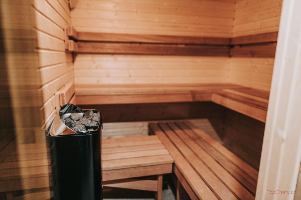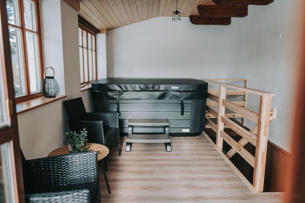 ✨ Součástí místnosti je i odpočinková zóna s televizí a rozkládací sedačkou, kde se komfortně vyspí až další dva hosté. Ze společenské zóny se dostanete na terasu. Po náročných výletech se k odpočinku nabízí wellness zóna s vířivkou, saunou, a venkovním bazénem se slanou vodou. Děti zajisté ocení i venkovní dřevěné hřiště.