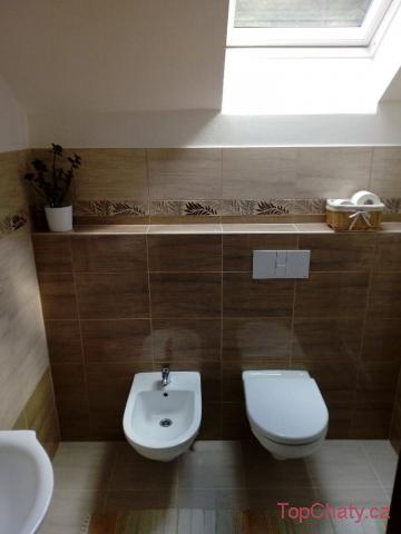 přízemí koupelna s vanou a WC, samostatné WC s bidetem v podkroví sprchoví kout a WC