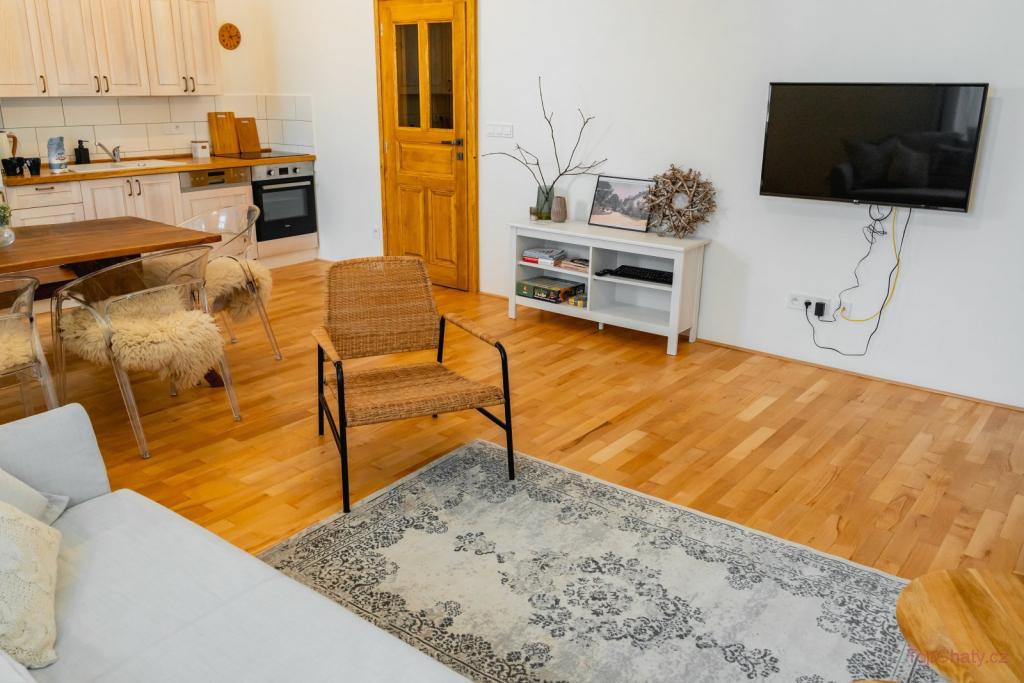 • 7L Apartmán I. A - V oddělené ložnici je manželská postel, patrová postel a otoman. Otevřená skříň a police na uskladnění ošacení. V obývacím pokoji je rozkládací pohovka s malými konferenčními stolky, křeslem a TV. Otevřený prostor s plně vybavenou kuchyní, jídelním stolem a klidovou zónou, rozkládací gauč. Sprchový kout, samostatné WC.